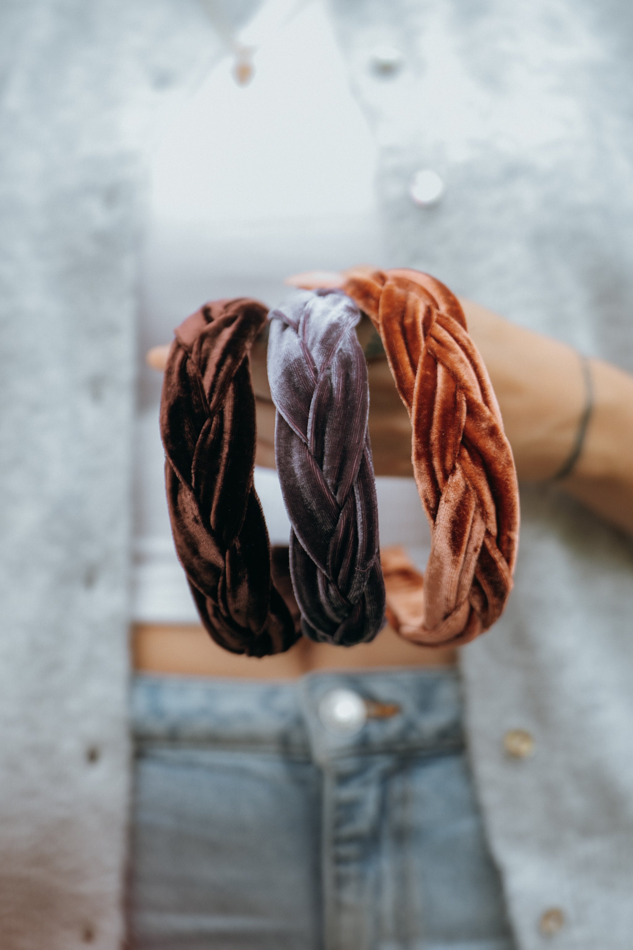 Fabric is braided and fixed to a high quality plastic 1 inch headband covered in the same velvet fabric.